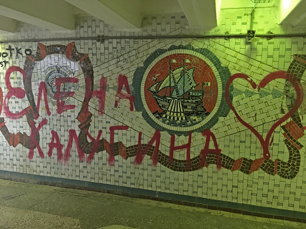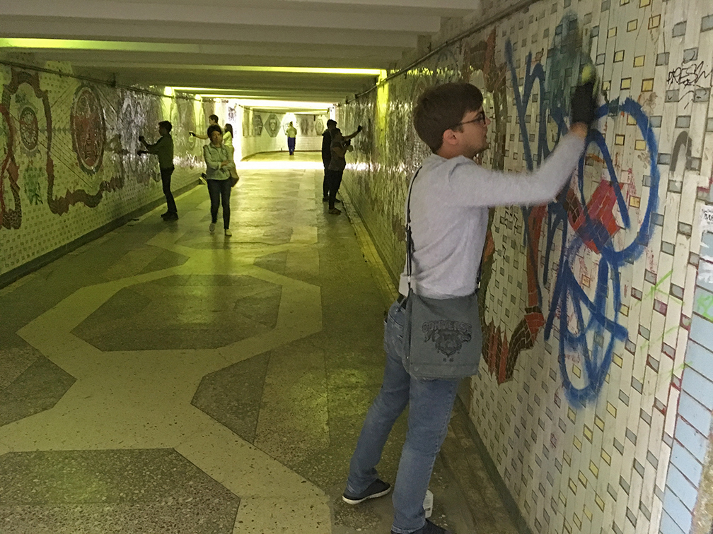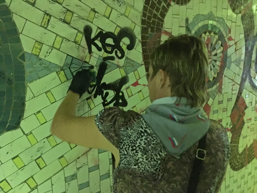 Сегодня около десяти человек спустились в переход у Нижнего парка. Его стены выложены мозаикой, которая рассказывает о символах и исторических вехах города. Многие видели мозаику в удручающем состоянии: вандалы расписывают стены признаниями в любви и бессмысленной белибердой.