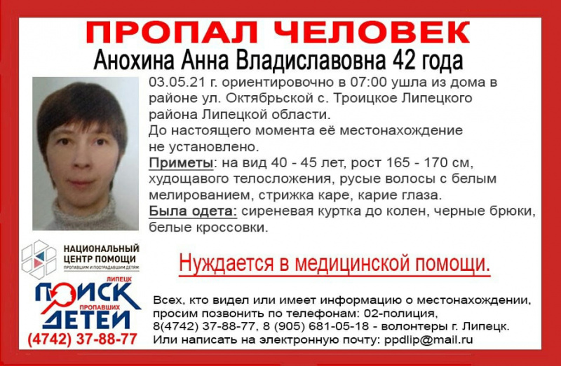 Женщина была одета в сиреневую куртку до колен, чёрные брюки, белые кроссовки. Потерявшаяся нуждается в медицинской помощи.