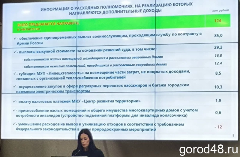 Эти средства будут направлены на оплату услуг по содержанию школы-новостройки в «Звездном» и дозакупку для нее и для школы во «Взлетном» учебного инвентаря (111,6 млн рублей), на единовременные выплаты военнослужащим по контракту на участие в СВО (85 млн рублей), на выплаты собственникам квартир расселенных аварийных домов, в том числе по решению судов (29 млн рублей), на поддержку работы городского электротранспорта (10,3 млн рублей), на субсидирование МУП «Липецктеплосеть», обеспечивающего теплом и горячей водой жителей Сырского Рудника и Сокола (8,5 млн рублей)...