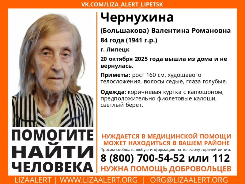 Приметы Валентины Чернухиной: рост 160 сантиметров, худощавого телосложения, волосы седые, глаза голубые. Она была одета в коричневую куртку с капюшоном и светлый берет, а обута, предположительно, в фиолетовые калоши.