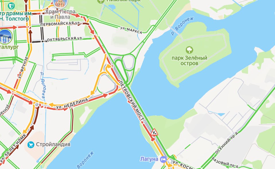 Сегодня утром на Петровском мосту из-за ремонта съезда к левому берегу возникла пробка.