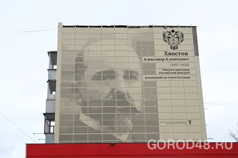 По правую сторону от минималистского «пиксельного» портрета прокурора указано: «Хвостов Александр Алексеевич (1857-1922) — Генерал-прокурор Российской империи, рождённый на земле Елецкой. Изготовлено благодаря средствам предпринимателей Липецкой торгово-промышленной палаты».