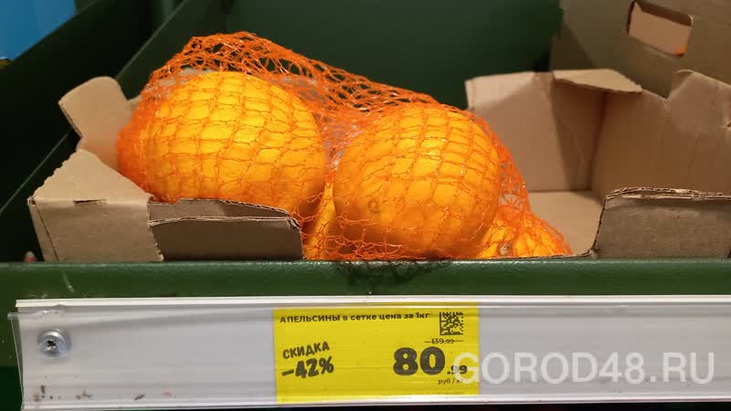 Вслед за мандаринами начали дешеветь апельсины, правда, пока из-за скидок. Мы нашли их по 80 рублей 99 копеек за килограмм.
