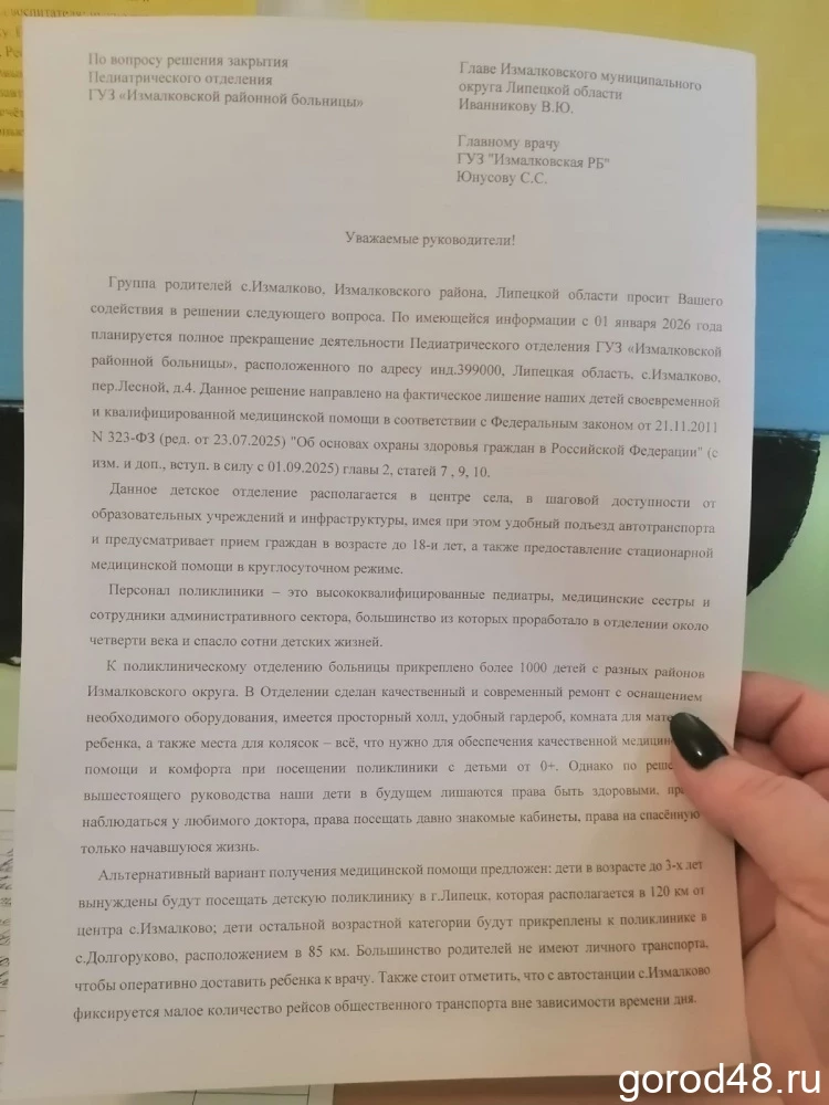 «Альтернативный вариант получения медицинской помощи предложен: дети в возрасте до 3-х лет вынуждены будут посещать детскую поликлинику в Липецке, которая располагается в 120 километрах от центра Измалково, дети остальной возрастной категории будут прикреплены к поликлинике в Долгоруково, расположенной в 85 километрах. Большинство родителей не имеют личного транспорта, чтобы оперативно доставить ребенка к врачу. Так же стоит отметить, что с автостанции Измалково фиксируется малое количество рейсов общественного транспорта вне зависимости от времени года», — говорится в обращении.