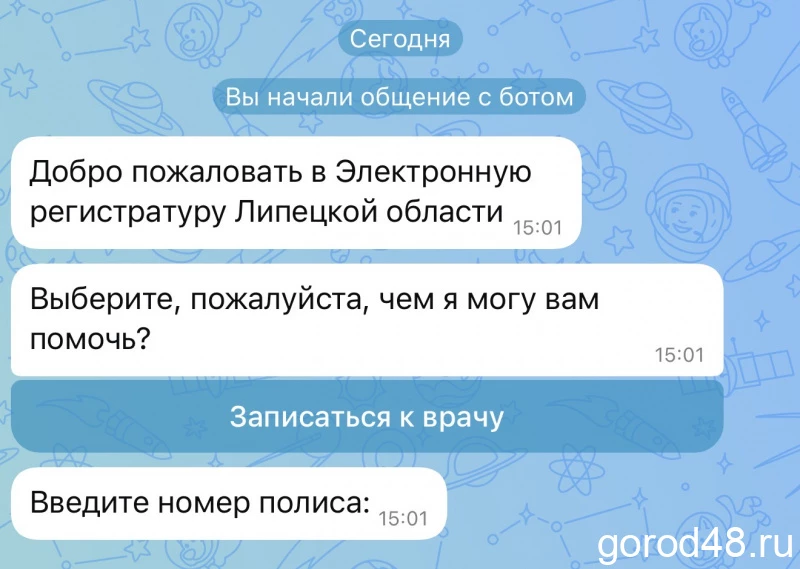 «Подать заявку можно в любое время в режиме 24/7. (...) Во время записи бот задаст вам все необходимые вопросы и проведет через процесс записи шаг за шагом, в том числе будут показаны доступные «окна» в расписании врачей», — говорится в анонcе чат-бота.