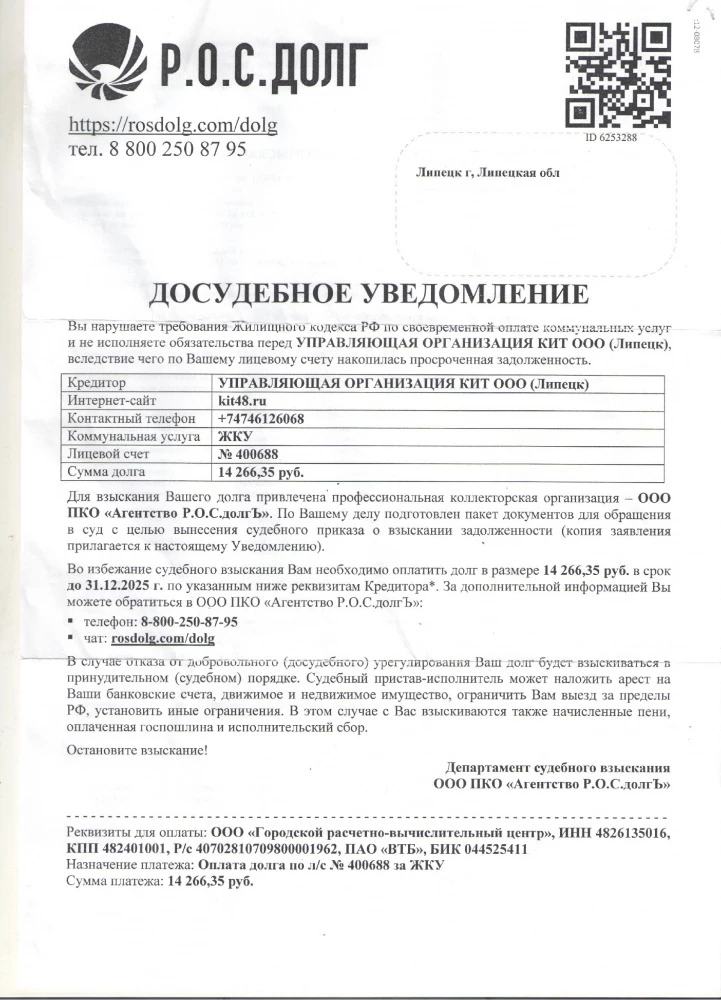 «Не знаю что и делать. Подозреваю, что стала жертвой какой-то мошеннической схемы. <…> Якобы долг за 16 месяцев. Ни квитанций, ни каких-то требований по оплате лицевого счета ранее не поступало. Телефон, указанный в претензии, недействителен, УК объяснений не дает <…> Специально прислали под Новый год, так как, думаю, расчёт на то, что перед Новым годом народ не будет разбираться во избежание блокировки счетов перед новогодними каникулами», — рассказала Ирина GOROD48.