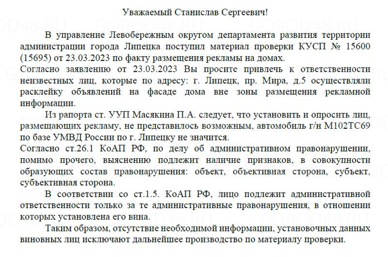Станислав Качарин обращался в полицию, просил привлечь к ответственности людей, наклеивавших такие листовки на дом № 5 по проспекту Мира. Желаемого результата он не добился: «установить и опросить лиц, размещающих рекламу не представилось возможным». Такой ответ получил депутат.