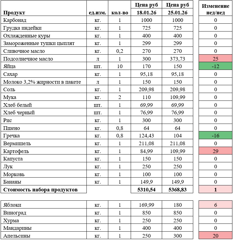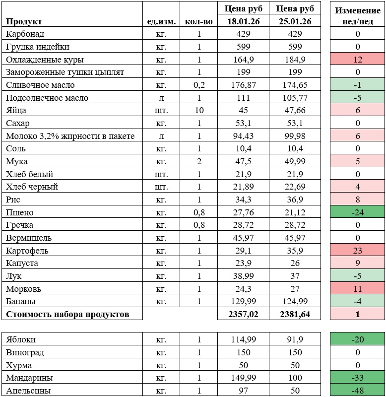 Дешевая корзина прибавила в цене в основном из-за закончившихся скидок на кур, которые на прошлой неделе стоили необыкновенно дешево.