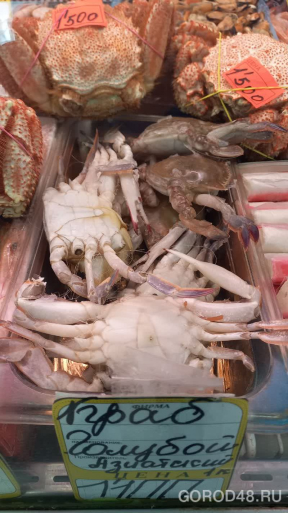 На Центральном рынке гурманам предлагают отведать краба голубого азиатского по 1 100 рублей за килограмм.