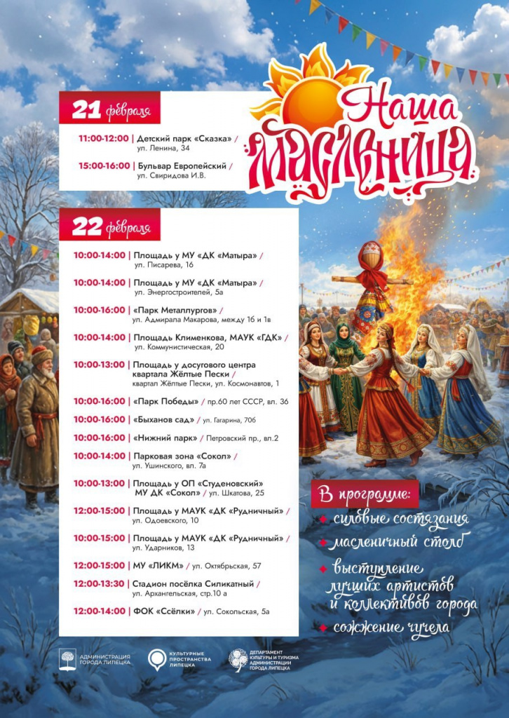 Первое чучело Масленицы сожгут в 14:00 в Сокольском парке, а в 15:00 — в Нижнем парке, парках Победы, Металлургов и в Быхановом саду.