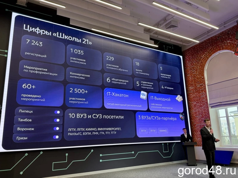 Сам современный кампус, в котором бережно сохранён исторический дух здания, превратился в настоящий центр притяжения, в место создания смыслов, в точку объединения технологий и людей. Здесь проходит масса важных для жизни региона мероприятий: фестивалей, интенсивов, киберспортивных турниров, форумов, встреч с экспертами, курсов и лекций. Среди таких знаковых событий — «IT-выходной», «Исторический бал», «День цифровой близости». Вообще, кампусы «Школы 21» открыты в 28 городах страны. Но липецкий — особенный: он на первом месте по количеству ежемесячных мероприятий и на втором — по числу регистраций в месяц с расчётом на всех жителей региона и по средней дневной заполняемости.