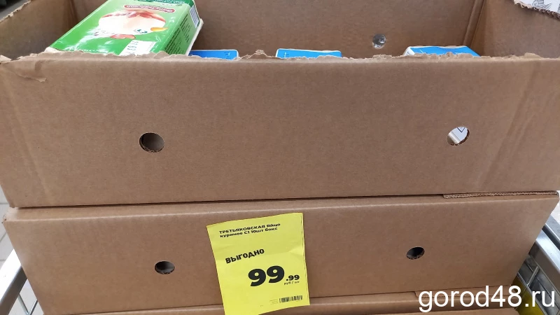 В одном из магазинов прямо у входа мы увидели развал с яйцами, мукой и подсолнечным маслом. Яйца стоили 100 рублей без копейки за десяток! А на ценнике красовалось слово «выгодно!» Причем в торговом зале десяток стоил уже 10 рублей меньше. Самые дешёвые яйца стоили 78 рублей 29 копеек.