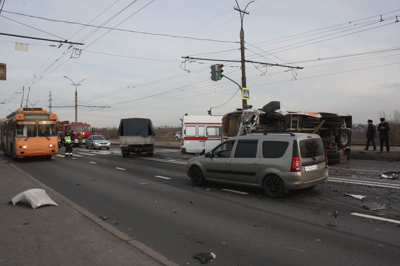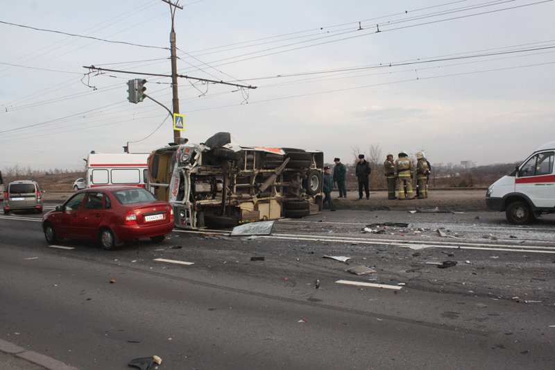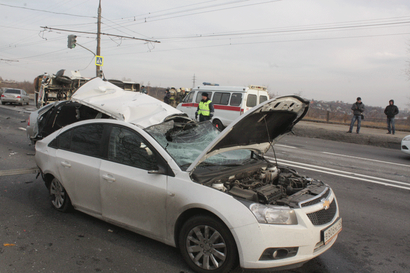 Крупная авария произошла сегодня в 8.25 Липецке на Октябрьском мосту. После столкновения с автомобилем "Шевроле" опрокинулся маршрутный автобус "ПАЗ" полный пассажиров. К месту аварии отправлены 4 машины "скорой помощи".