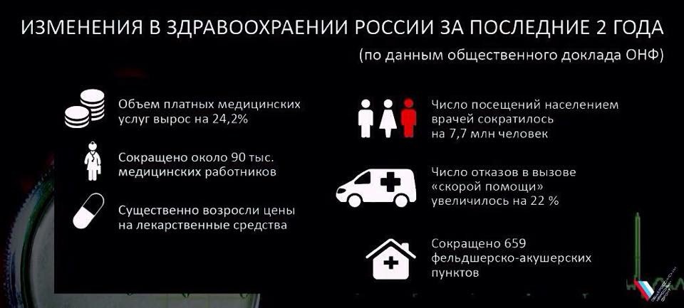 Сегодня в Москве открылся форум Общероссийского Народного Фронта «За качественную и доступную медицину». В повестке дня – самые насущные вопросы здравоохранения. Изначально форум оказался на позициях признания провала реформ здравоохранения. Звучали, порой, убийственные оценки оптимизации медицинских учреждений, которая, по мнению некоторых участников, привела к повышению не только недоверия пациентов к отечественному здравоохранению, но даже к повышению смертности населения.