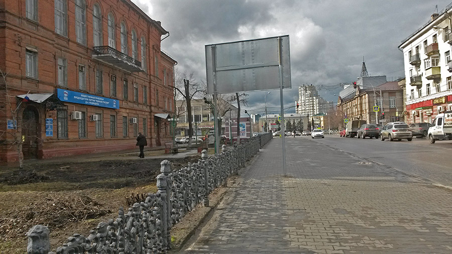 Одна опора указателя культурных мест в исторической части Липецка находится на газоне, а вторая - на тротуаре.
