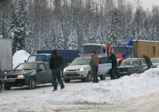 Машины встали из-за грузовиков, которые из-за непогоды и гололеда не могут проехать. Очевидцы сообщают, что стоят в пробке уже более семи часов.