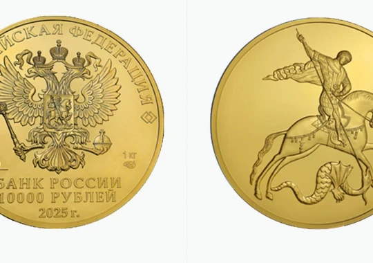 Новая монета отчеканена из золота 999 пробы и имеет вес один килограмм при диаметре сто миллиметров. На оборотной стороне монеты изображен Георгий Победоносец на коне, поражающий копьем змея.