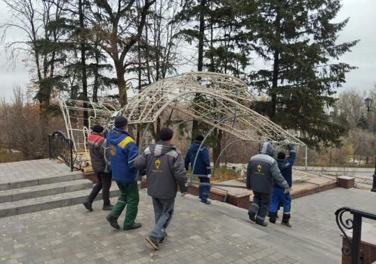 Липецк продолжают украшать к Новому году. Сегодня устанавливают световую композицию на каскадном фонтане.