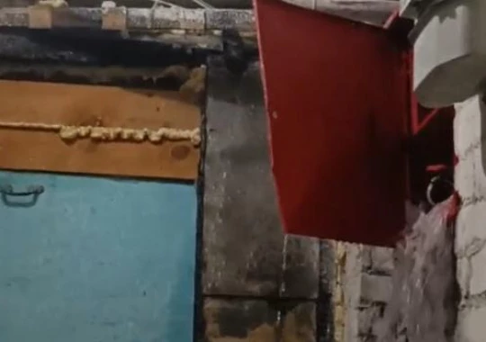 Подъезд весь окутан паром, кипяток бьет в дверь одной из квартир.